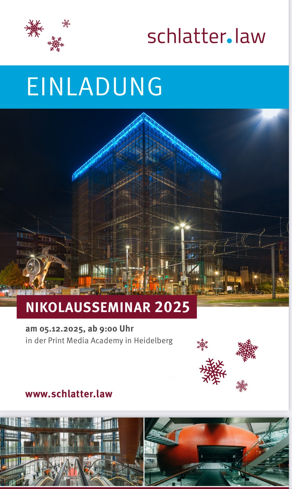 Gebäude steht seit Ende 2024 im Eigentum von Hans-Jörg Kraus, der dieses glasumhüllten Bauwerk in den nächsten Monaten technisch und energetisch auf den neuesten Stand bringen und dann wiedereröffnen möchte. Mit dem Nikolausseminar besteht letztmals die Möglichkeit, die Print Media Academy vor den umfangreichen Sanierungsarbeiten zu erleben und zudem mit unseren Experten aus dem Bau- und Immobilienrecht aktuelle Rechtsthemen zu diskutieren. Weitere Informationen zur Veranstaltung und zu Ihrer Anmeldung entnehmen Sie bitte dem Anhang. WIR FREUEN UNS AUF IHR KOMMEN!